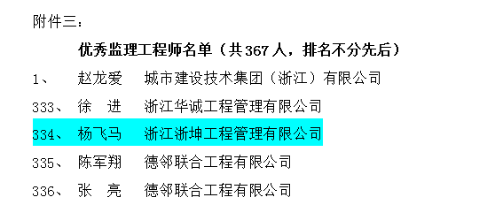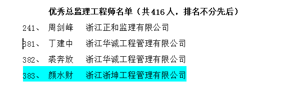 2022年8月31日,浙江省全过程工程咨询与监理管理协会下发《关于公布2021年度浙江省优秀监理企业和优秀监理人员的通知》浙咨监协[2022]17号文,根据《关于评选2021年度浙江省优秀监理企业和优秀总监理工程师、优秀监理工程师的通知》(浙咨监协[2022]8号文)要求,省协会组织专家和评委会进行评审,并经公示,全省61家企业评为省优秀监理企业、416人被评省优秀总监理工程师、367人评为省优秀监理工程师