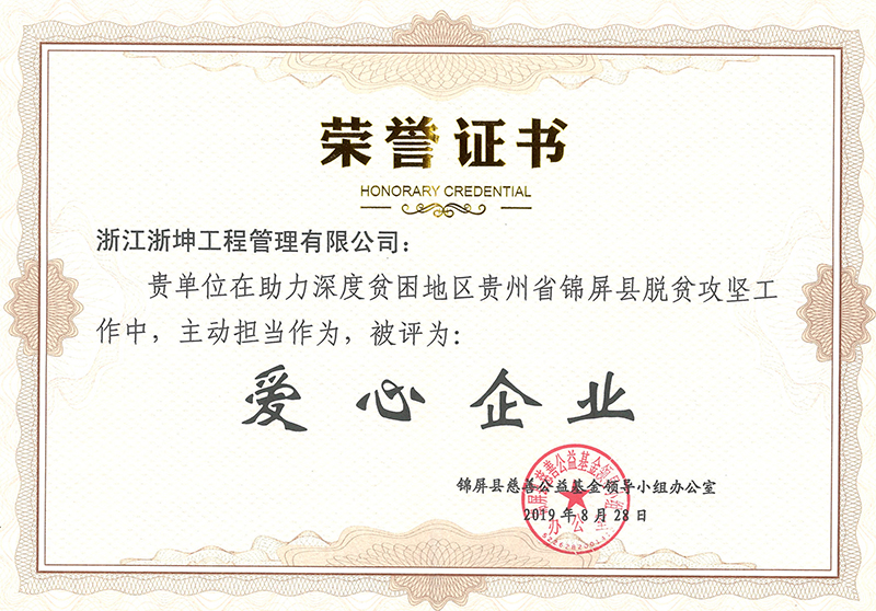 2019年助力深度贫困地区贵州省锦屏县脱贫攻坚工作中被评为爱心企业